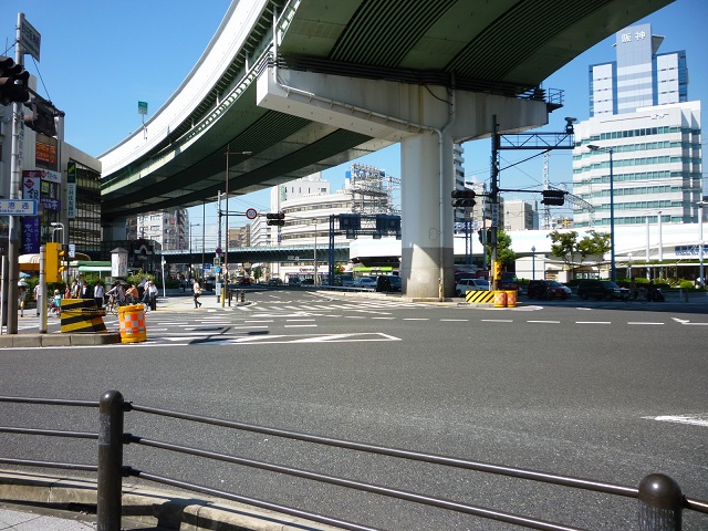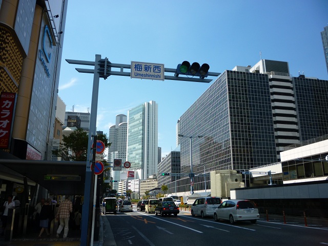 梅田新道交差点、大阪市道路元標。