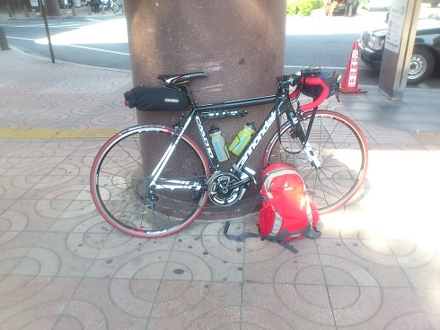 ホテルの前で輪行解除をしていると、自転車旅のお約束イベント発生。