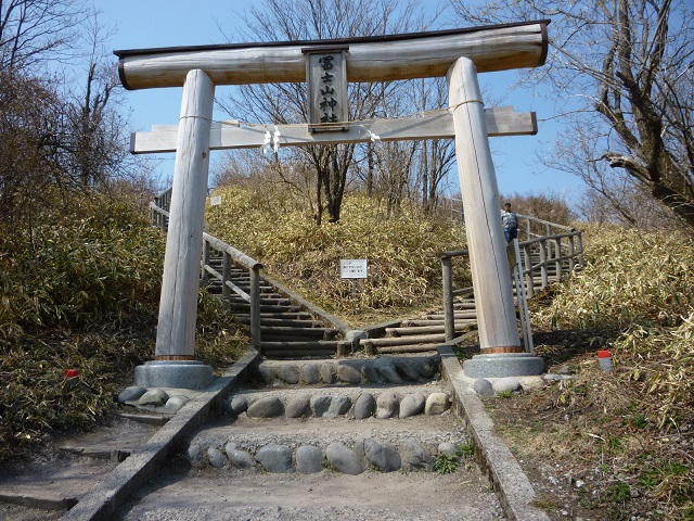 ロープウェイの山頂駅から少し歩いて登ると鳥居があります。