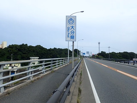 信号少ない快走路を走っていると大分県の案内板。